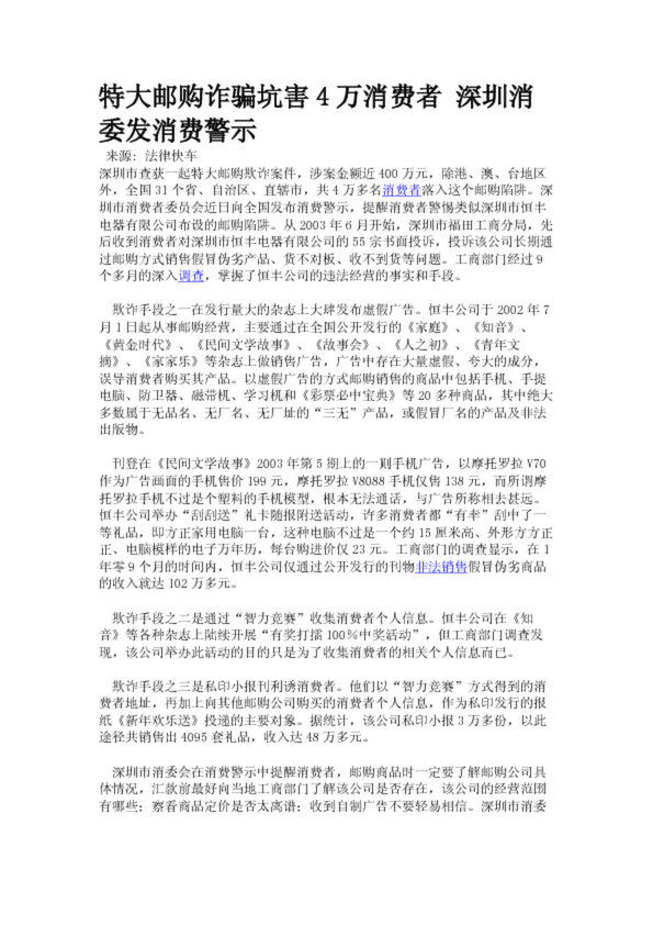 特大郵購詐騙坑害4萬消費者 深圳消委發消費警示