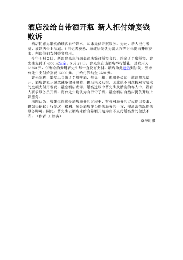 酒店沒給自帶酒開瓶 新人拒付婚宴錢敗訴