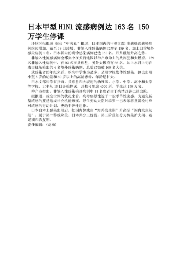 日本甲型H1N1流感病例達163名 150萬學生停課