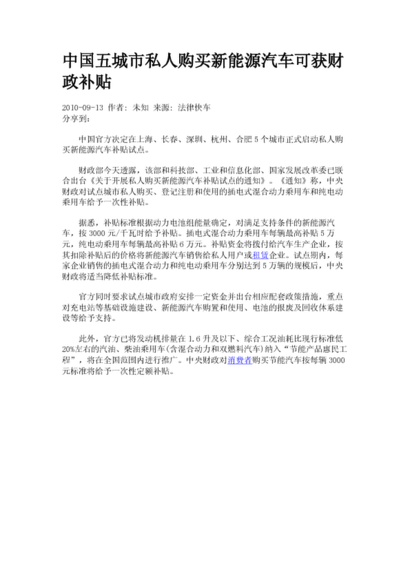 中國五城市私人購買新能源汽車可獲財政補貼(2.89KB)