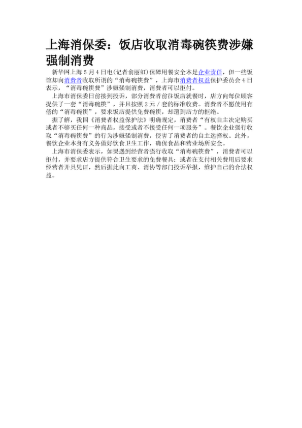 上海消保委:飯店收取消毒碗筷費涉嫌強制消費(17.67KB)