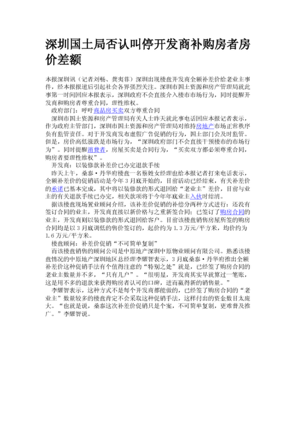 深圳國土局否認(rèn)叫停開發(fā)商補(bǔ)購房者房價差額