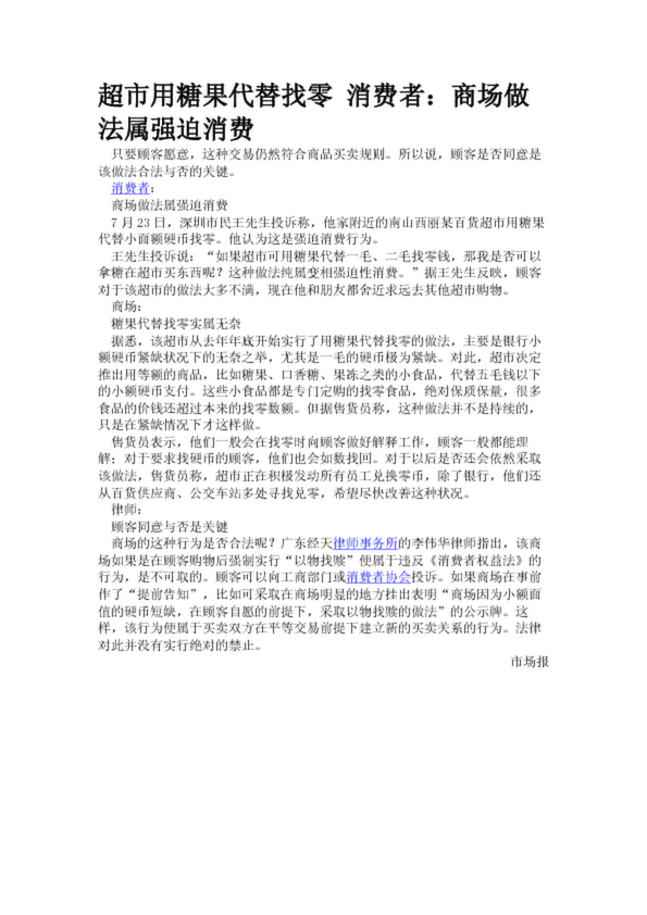 超市用糖果代替找零 消費者:商場做法屬強迫消費