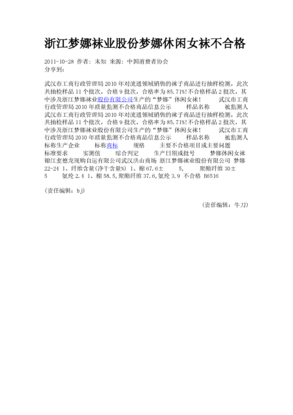 浙江夢娜襪業股份夢娜休閑女襪不合格