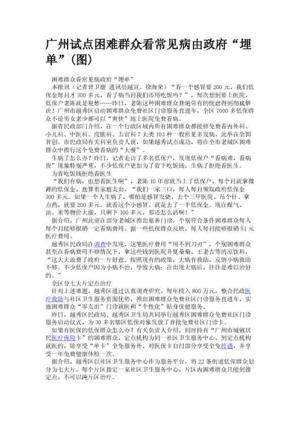 廣州試點困難群眾看常見病由政府“埋單”(圖)