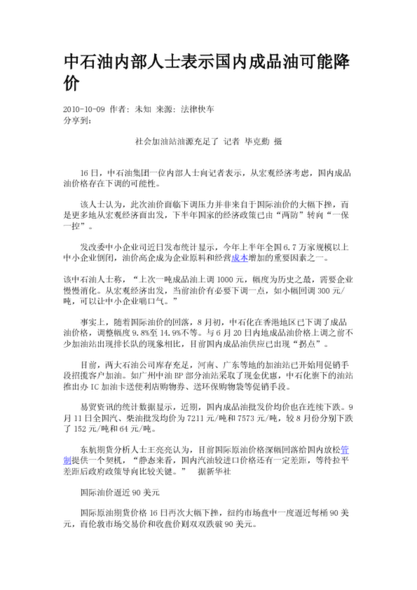 中石油內(nèi)部人士表示國(guó)內(nèi)成品油可能降價(jià)