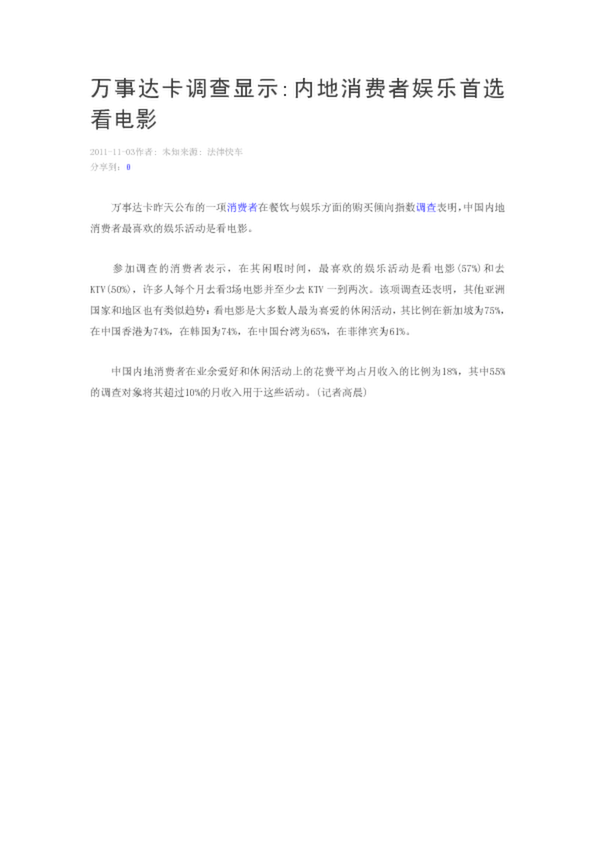 萬事達卡調查顯示內地消費者娛樂首選看電影(15.00KB)