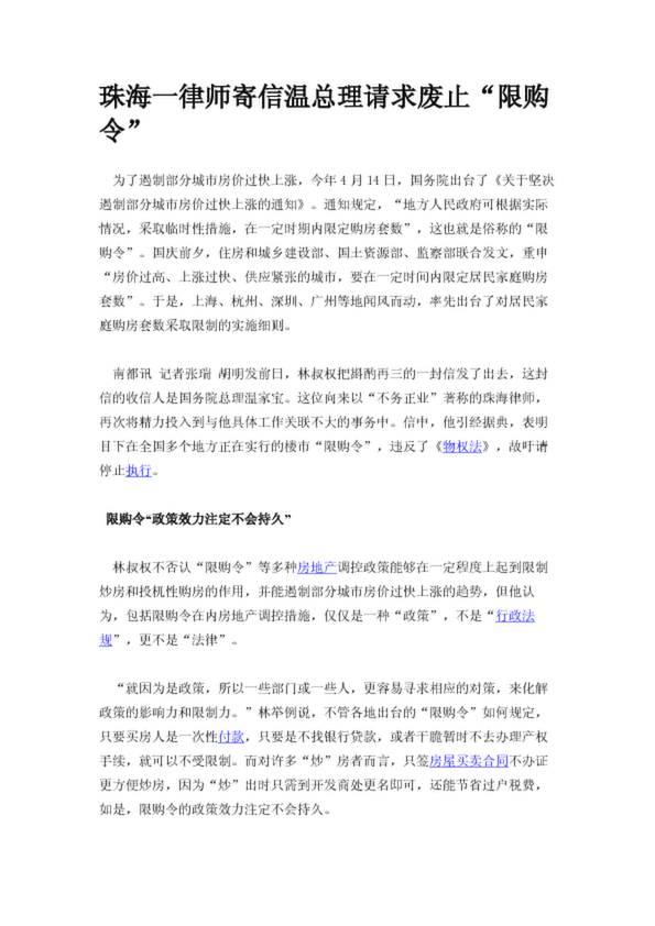珠海一律師寄信溫總理請求廢止“限購令”(26.18KB)