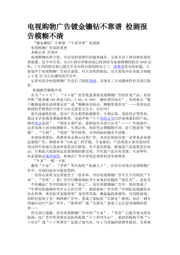 電視購物廣告鍍金鑲鉆不靠譜 檢測報告模糊不清(24.10KB)
