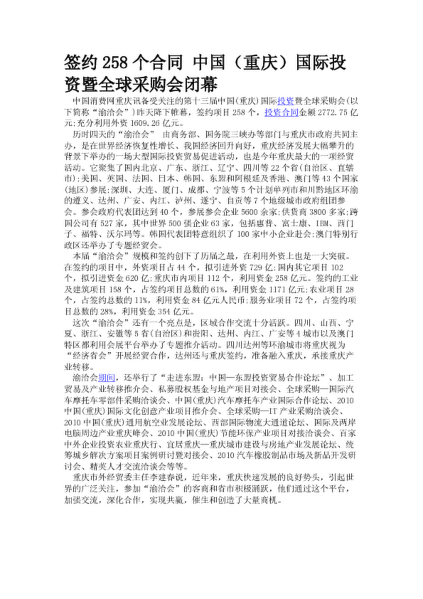 簽約258個合同 中國(重慶)國際投資暨全球采購會閉幕
