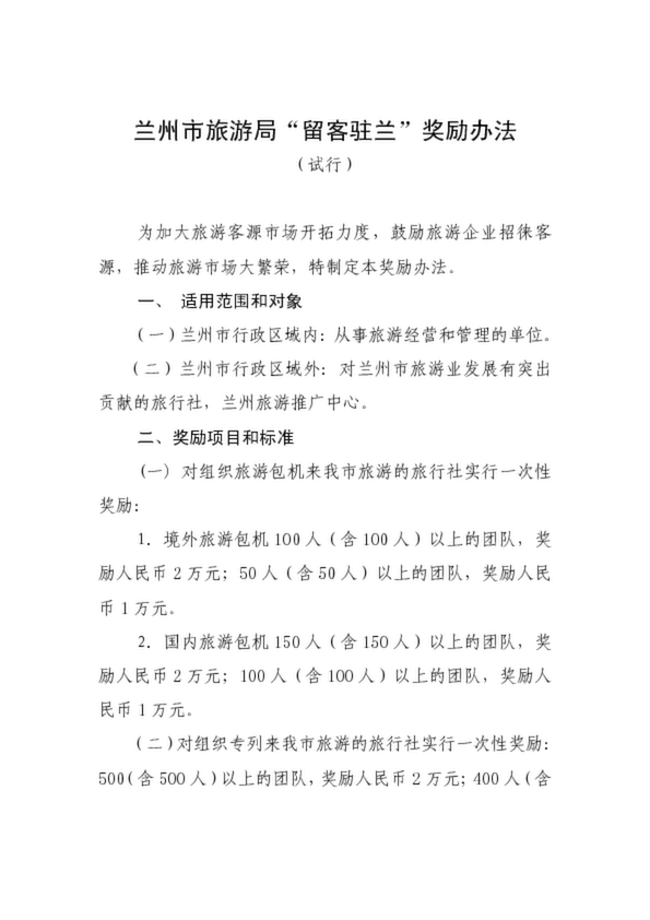 蘭州市旅游局“留客駐蘭”獎(jiǎng)勵(lì)辦法
