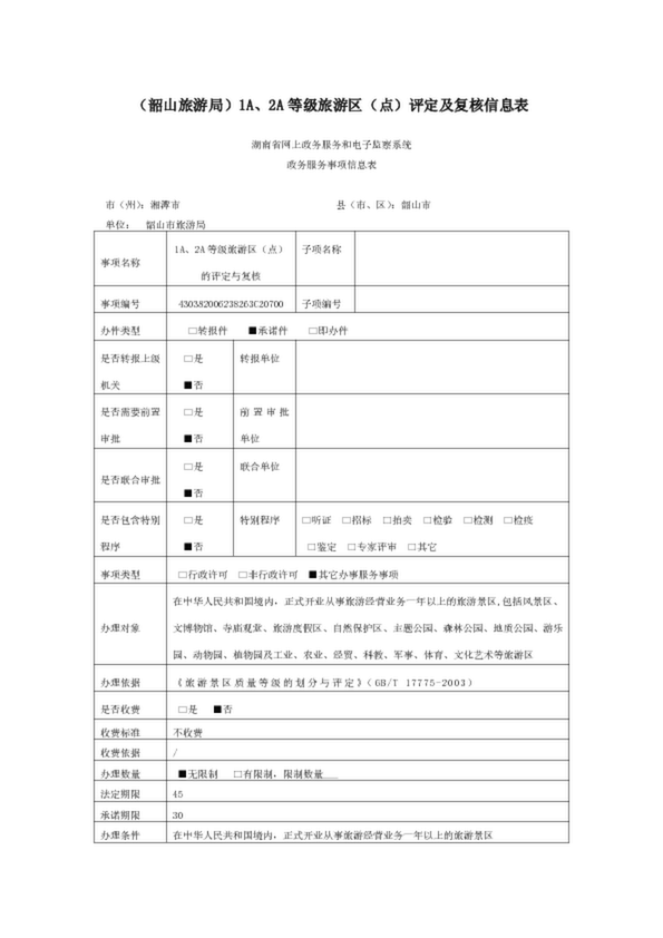 (韶山旅游局)1A、2A等級旅游區(點)評定及復核信息表