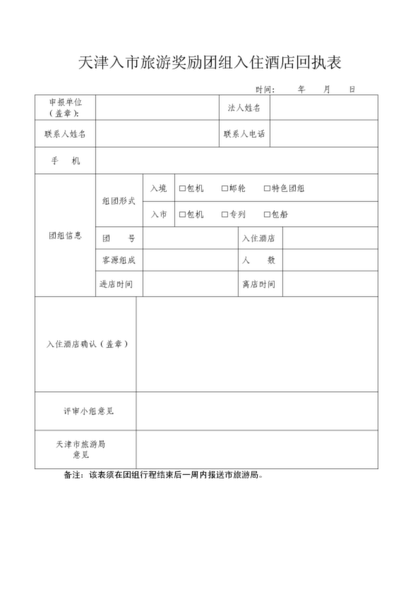 天津入市旅游獎勵團組入住酒店回執表(32.00KB)