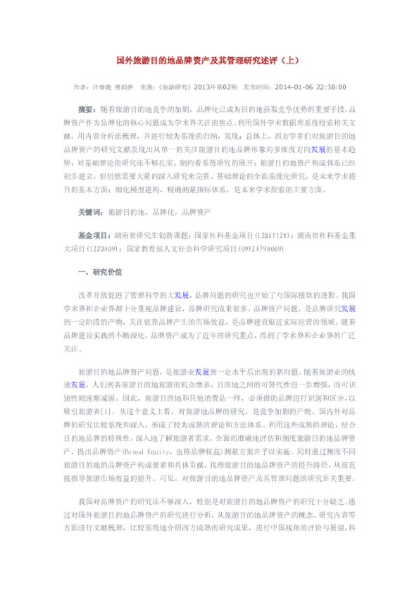 國外旅游目的地品牌資產及其管理研究述評