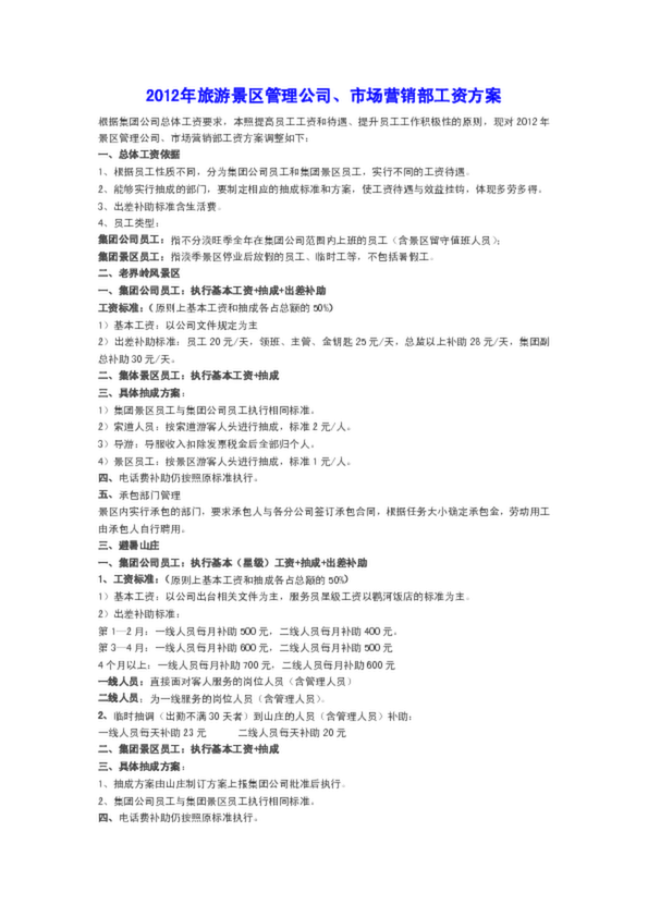 2012年旅游景區(qū)管理公司、市場(chǎng)營(yíng)銷部工資方案