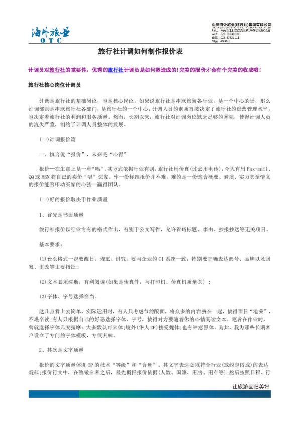 旅行社計調如何制作報價表,與各家同業旅行社聯系,經常用電腦向同業旅行社要最新的報價和行程,向同業的旅行社問清楚各家的線路的具體行程安排,包括餐標、住宿條件、旅游車信息、往返交通時間…………許多細枝末節的事情