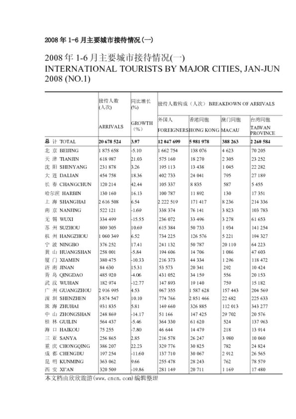 2008年1-6月主要城市接待情況(一)