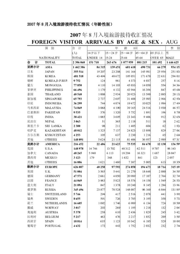 2007年8月入境旅游接待收匯情況(年齡性別)
