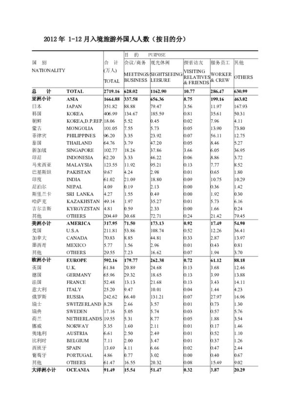 2012年 1-12月入境旅游外國人人數(shù)(按目的分)