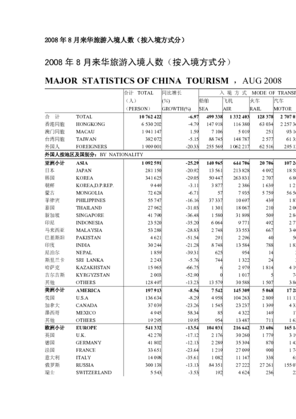 2008年8月來華旅游入境人數(按入境方式分)(0.14MB)