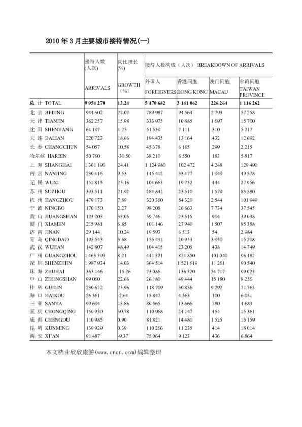 2010年3月主要城市接待情況(一)(83.83KB)