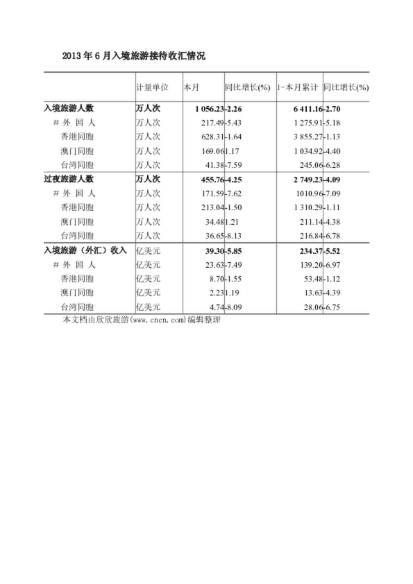 2013年6月入境旅游接待收匯情況(33.51KB)
