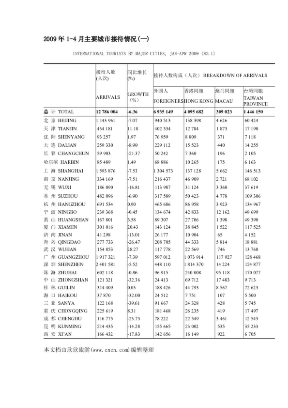 2009年1-4月主要城市接待情況(一)