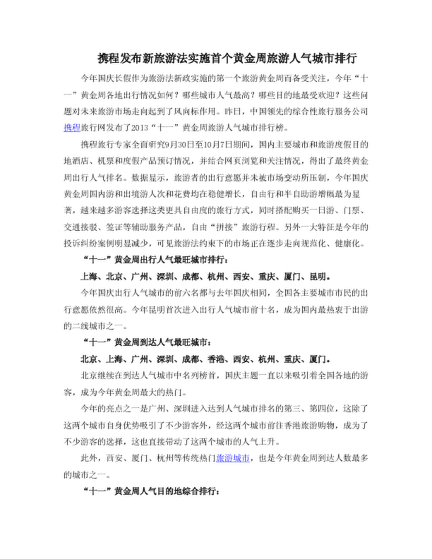 攜程發布新旅游法實施首個黃金周旅游人氣城市排行(22.50KB)