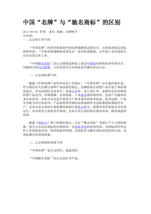 中國“名牌”與“馳名商標”的區別(3.69KB)
