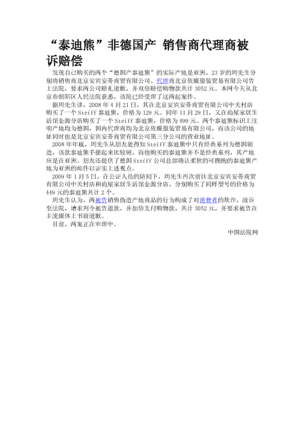 “泰迪熊”非德國(guó)產(chǎn) 銷售商代理商被訴賠償